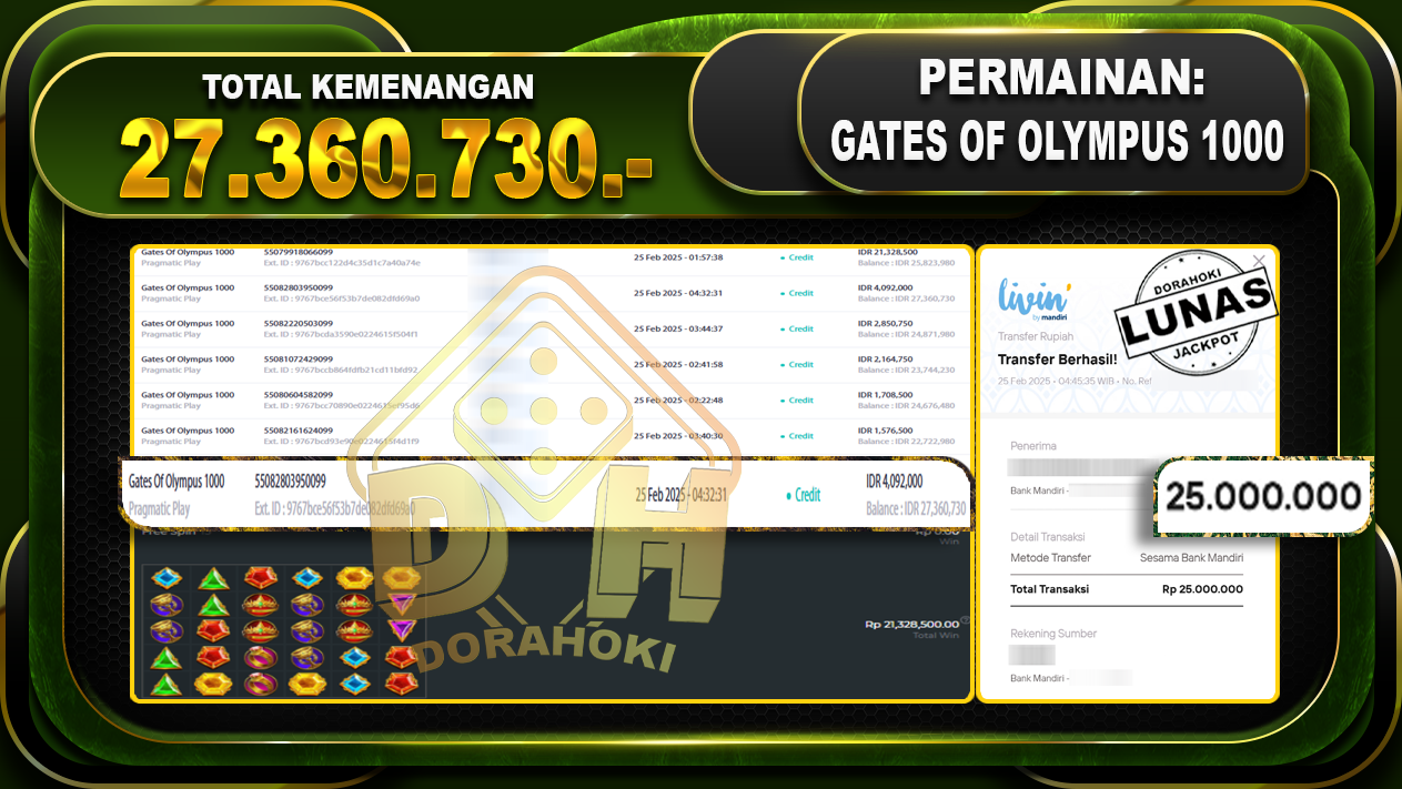 Bukti JP GATES OF OLYMPUS 1000 – ucapkan selamat kepada user id broyxxx atas kemenangan di GATES OF OLYMPUS 1000 dengan total kemenangan Rp.27.360.730,- . Yang pasti nya langsung LUNAS sesuai bukti ya bosku. Dorahoki nih bosku berapapun akan tetap kami bayar lunas ya bosku.