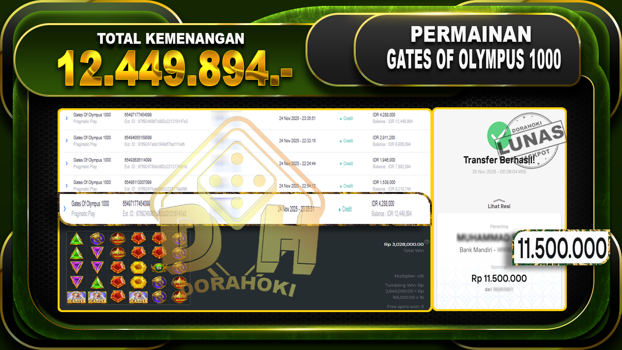 Bukti JP Gates Of Olympus 1000 – ucapkan selamat kepada user id broxxxx atas kemenangan di Gates Of Olympus 1000 dengan total kemenangan Rp.12.449.894,- Yang pasti nya langsung LUNAS sesuai bukti ya bosku. Dorahoki nih bosku berapapun akan tetap kami bayar lunas ya bosku