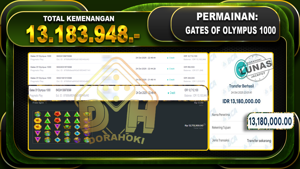 Bukti JP Gates Of Olympus 1000 – ucapkan selamat kepada user id chaxxxxx atas kemenangan di Gates Of Olympus 1000 dengan total kemenangan Rp.13,183,948,- Yang pasti nya langsung LUNAS sesuai bukti ya bosku. Dorahoki nih bosku berapapun akan tetap kami bayar lunas ya bosku