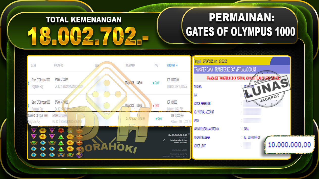Bukti JP GATES OF OLYMPUS 1000 – ucapkan selamat kepada user id Waoxxx atas kemenangan di GATES OF OLYMPUS 1000 dengan total kemenangan Rp.18.002.702,- . Yang pasti nya langsung LUNAS sesuai bukti ya bosku. Dorahoki nih bosku berapapun akan tetap kami bayar lunas ya bosku.