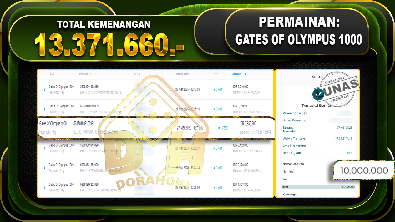 Bukti JP GATES OF OLYMPUS 1000 – ucapkan selamat kepada user id Pulxxx atas kemenangan di GATES OF OLYMPUS 1000 dengan total kemenangan Rp.13.371.660,- . Yang pasti nya langsung LUNAS sesuai bukti ya bosku. Dorahoki nih bosku berapapun akan tetap kami bayar lunas ya bosku.