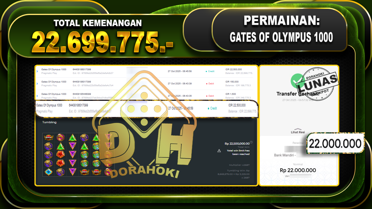 Bukti JP Gates Of Olympus 1000 – ucapkan selamat kepada user id arixxxxxx atas kemenangan di  Gates Of Olympus 1000 dengan total kemenangan Rp.22,699,775,- Yang pasti nya langsung LUNAS sesuai bukti ya bosku. Dorahoki nih bosku berapapun akan tetap kami bayar lunas ya bosku