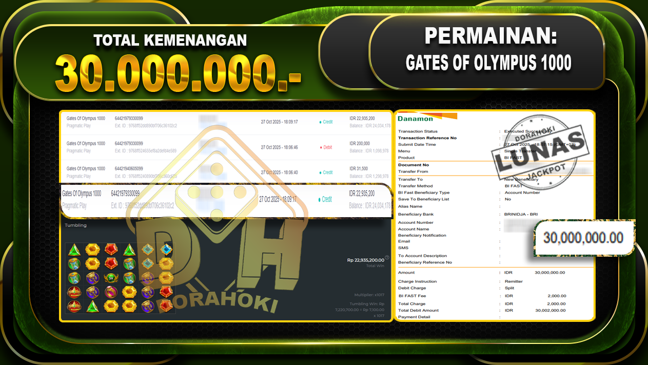 Bukti JP Gates Of Olympus 1000 – ucapkan selamat kepada user id natxxxxx atas kemenangan di Gates Of Olympus 1000 dengan total kemenangan Rp.30,000,000,- Yang pasti nya langsung LUNAS sesuai bukti ya bosku. Dorahoki nih bosku berapapun akan tetap kami bayar lunas ya bosku
