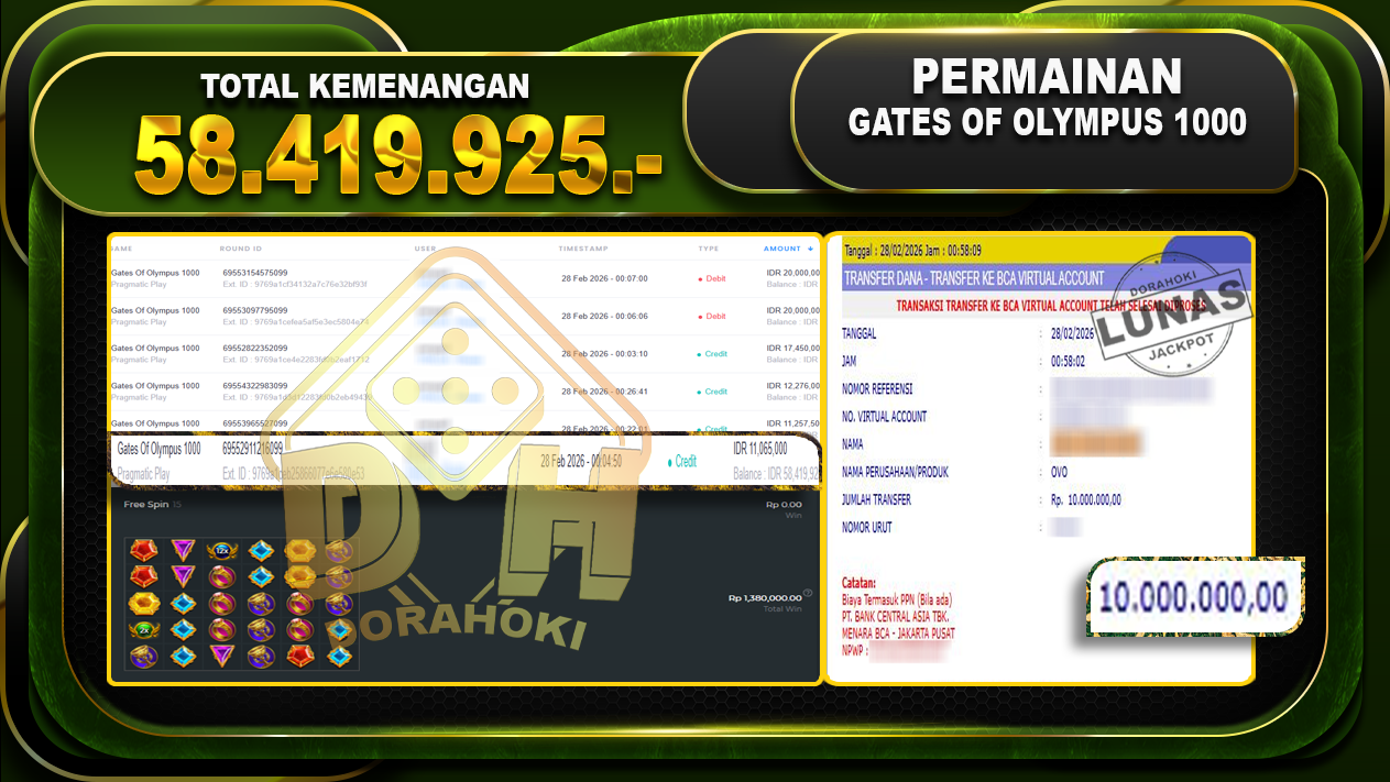 Bukti JP Gates Of Olympus 1000 Selamat Kepada User ID : Penxxx atas kemenangan Gates Of Olympus 1000 Dengan Nominal Sebesar Rp 58.419.925,- . Yang pasti nya langsung LUNAS Sesuai Bukti.