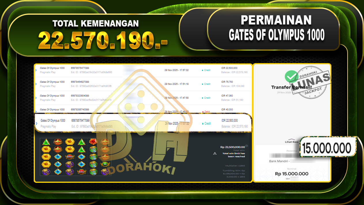 Bukti JP Gates Of Olympus 1000 – ucapkan selamat kepada user id belxxxxx atas kemenangan di Gates Of Olympus 1000 dengan total kemenangan Rp.22.570.190,- Yang pasti nya langsung LUNAS sesuai bukti ya bosku. Dorahoki nih bosku berapapun akan tetap kami bayar lunas ya bosku
