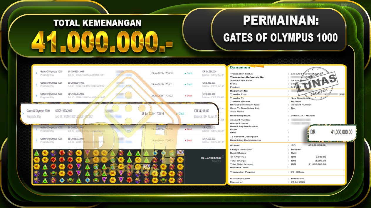 Bukti JP GATES OF OLYMPUS 1000 – ucapkan selamat kepada user id YUSxxx atas kemenangan di GATES OF OLYMPUS 1000 dengan total kemenangan Rp.41.000.000,- . Yang pasti nya langsung LUNAS sesuai bukti ya bosku. Dorahoki nih bosku berapapun akan tetap kami bayar lunas ya bosku.