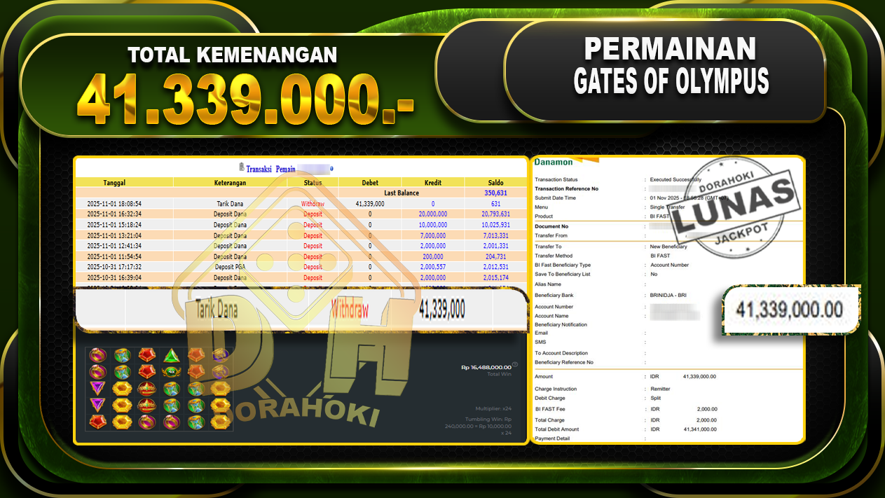 Bukti JP Gates Of Olympus 1000 – ucapkan selamat kepada user id yahxxxxx atas kemenangan di Gates Of Olympus 1000 dengan total kemenangan Rp.41.339.000,- Yang pasti nya langsung LUNAS sesuai bukti ya bosku. Dorahoki nih bosku berapapun akan tetap kami bayar lunas ya bosku