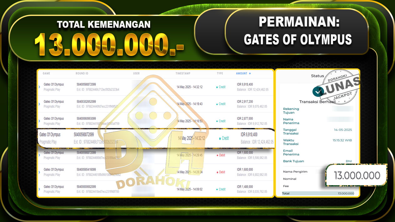 Bukti JP GATES OF OLYMPUS – ucapkan selamat kepada user id Korxxx atas kemenangan di GATES OF OLYMPUS 1000 dengan total kemenangan Rp.13.000.000,- . Yang pasti nya langsung LUNAS sesuai bukti ya bosku. Dorahoki nih bosku berapapun akan tetap kami bayar lunas ya bosku.