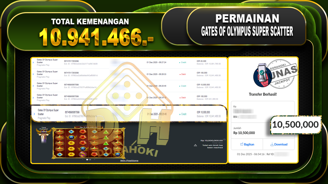 Bukti JP Gates Of Olympus Super Scatter – ucapkan selamat kepada user id hadxxxx atas kemenangan di Gates Of Olympus Super Scatter dengan total kemenangan Rp.10.941.466,- Yang pasti nya langsung LUNAS sesuai bukti ya bosku. Dorahoki nih bosku berapapun akan tetap kami bayar lunas ya bosku