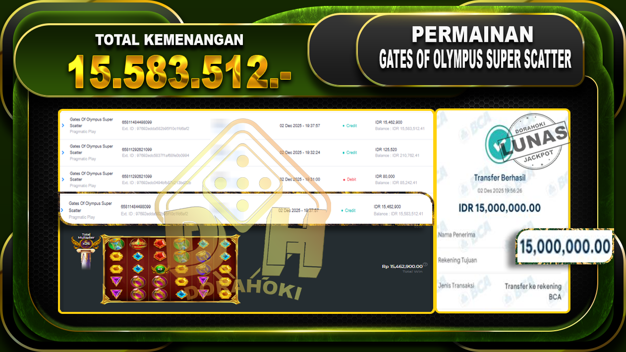 Bukti JP Gates Of Olympus Super Scatter – ucapkan selamat kepada user id bosxxxxx atas kemenangan di Gates Of Olympus Super Scatter dengan total kemenangan Rp.15.583.512,- Yang pasti nya langsung LUNAS sesuai bukti ya bosku. Dorahoki nih bosku berapapun akan tetap kami bayar lunas ya bosku
