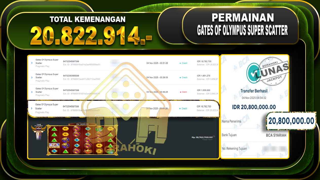 Bukti JP Gates Of Olympus Super Scatter – ucapkan selamat kepada user id kinxxxx  atas kemenangan di  Gates Of Olympus Super Scatter dengan total kemenangan Rp.20.822.914,- Yang pasti nya langsung LUNAS sesuai bukti ya bosku. Dorahoki nih bosku berapapun akan tetap kami bayar lunas ya bosku