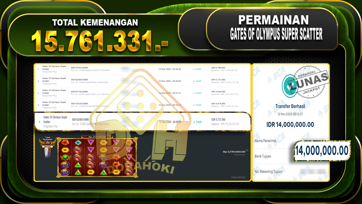 Bukti JP Gates Of Olympus Super Scatter – ucapkan selamat kepada user id hadxxxx atas kemenangan di Gates Of Olympus Super Scatter dengan total kemenangan Rp.15.761.331,- Yang pasti nya langsung LUNAS sesuai bukti ya bosku. Dorahoki nih bosku berapapun akan tetap kami bayar lunas ya bosku