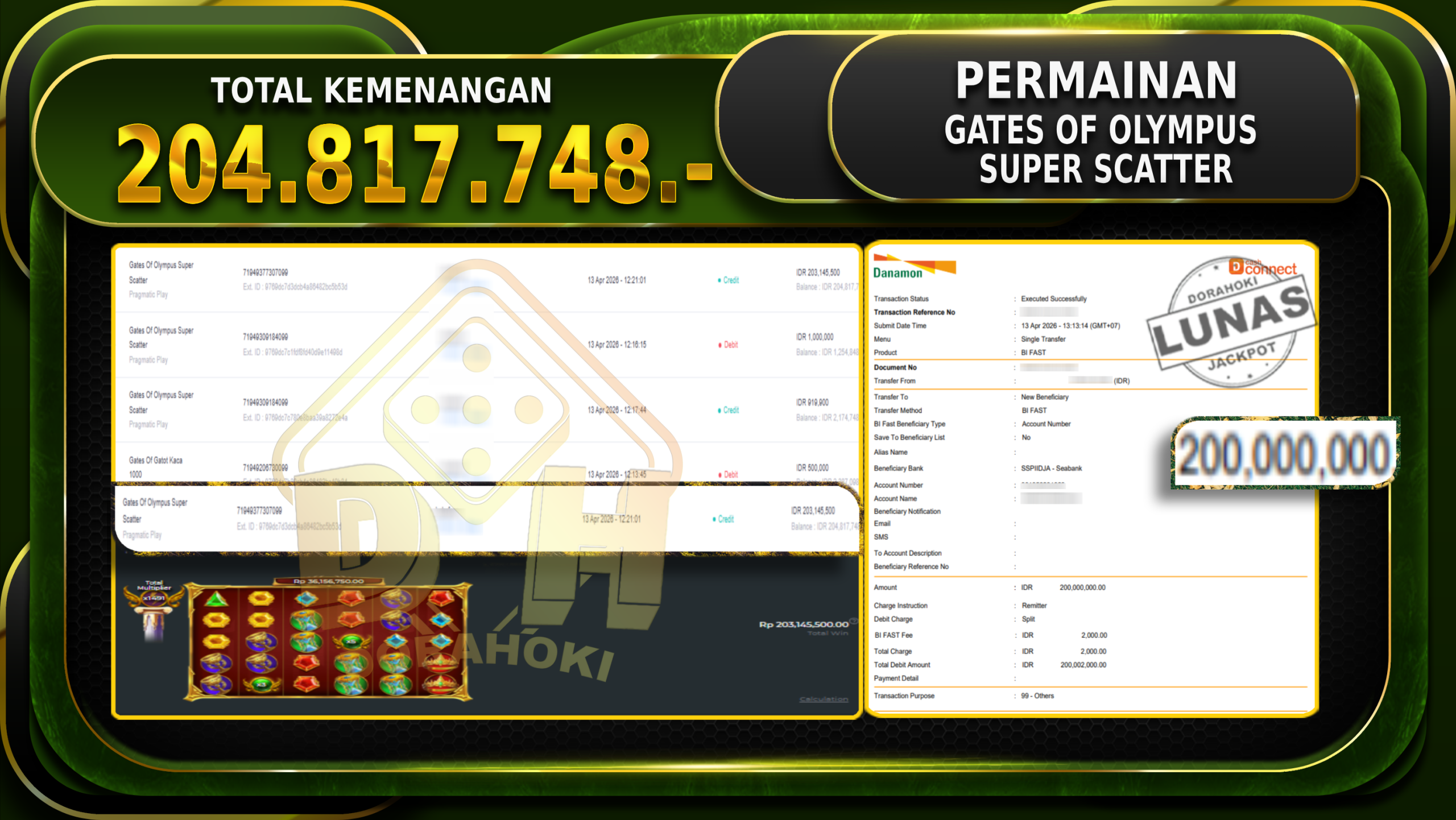 Bukti JP Gates Of Olympus Super Scatter – Selamat Kepada user ID : Babxxxx atas kemenangan Gates Of Olympus Super Scatter Dengan Nominal Sebesar Rp.204.817.748,- Yang pasti nya langsung LUNAS Sesuai Bukti.