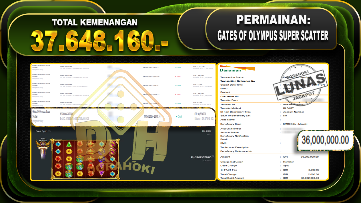 Bukti JP Gates Of Olympus Super Scatter – ucapkan selamat kepada user id ajtxxxx atas kemenangan di Gates Of Olympus Super Scatter dengan total kemenangan Rp.37.648.160,- Yang pasti nya langsung LUNAS sesuai bukti ya bosku. Dorahoki nih bosku berapapun akan tetap kami bayar lunas ya bosku