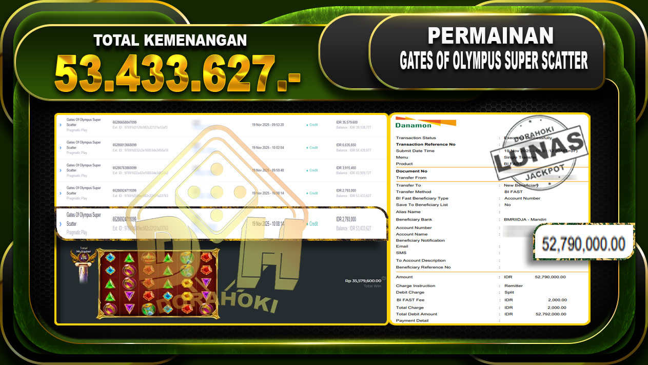 Bukti JP Gates Of Olympus Super Scatter – ucapkan selamat kepada user id janxxx  atas kemenangan di  Gates Of Olympus Super Scatter dengan total kemenangan Rp.53.433.627,- Yang pasti nya langsung LUNAS sesuai bukti ya bosku. Dorahoki nih bosku berapapun akan tetap kami bayar lunas ya bosku