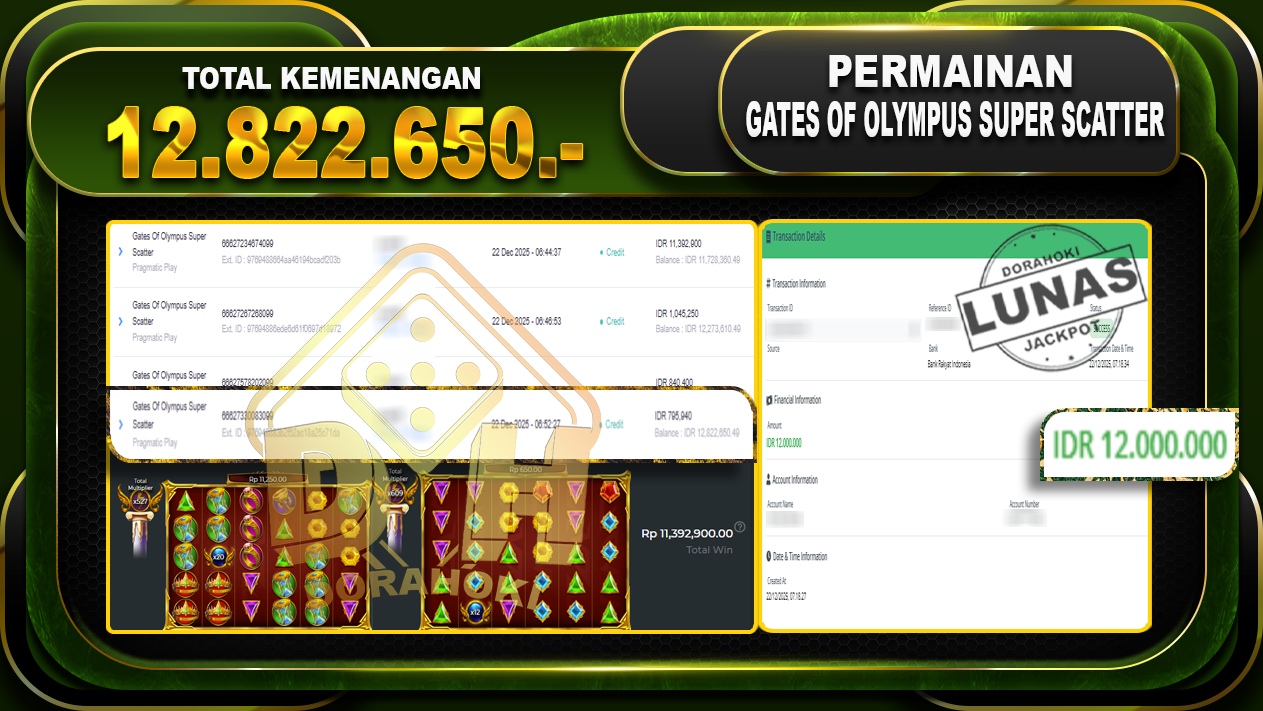 Bukti JP Gates Of Olympus Super Scatter – ucapkan selamat kepada user id anixxx atas kemenangan di Gates Of Olympus Super Scatter dengan total kemenangan Rp.12.822.650,- Yang pasti nya langsung LUNAS sesuai bukti ya bosku. Dorahoki nih bosku berapapun akan tetap kami bayar lunas ya bosku