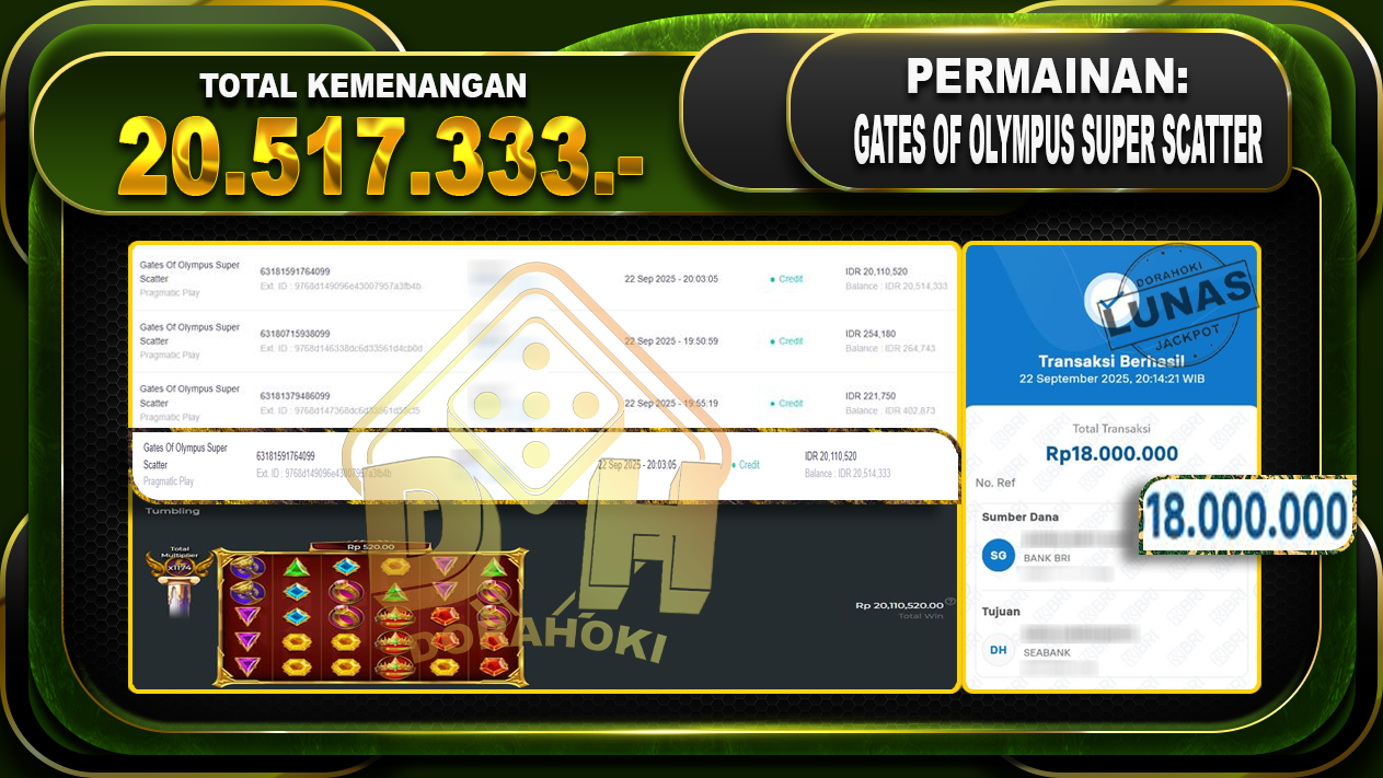 Bukti JP Gates Of Olympus Super Scatter – ucapkan selamat kepada user id abaxxxxx atas kemenangan di Gates Of Olympus Super Scatter dengan total kemenangan Rp.20.517.333,- Yang pasti nya langsung LUNAS sesuai bukti ya bosku. Dorahoki nih bosku berapapun akan tetap kami bayar lunas ya bosku