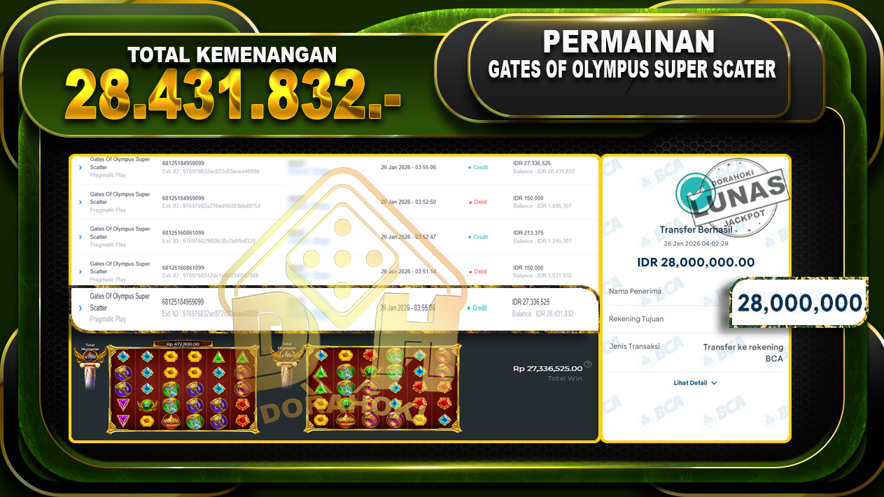 Bukti JP Gates Of Olympus Super Scatter – Selamat Kepada user id lakxxxxx atas kemenangan Gates Of Olympus Super Scatter Dengan Nominal Sebesar Rp.28.431.832,- Yang pasti nya langsung LUNAS Sesuai Bukti.