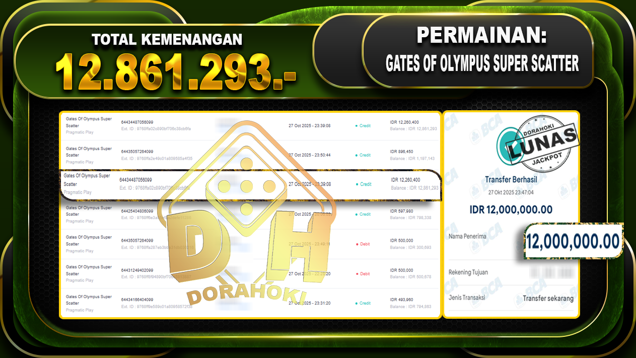 Bukti JP Gates Of Olympus Super Scatter – ucapkan selamat kepada user id putxxxxxxx atas kemenangan di Gates Of Olympus Super Scatter dengan total kemenangan Rp.12.861.293,- Yang pasti nya langsung LUNAS sesuai bukti ya bosku. Dorahoki nih bosku berapapun akan tetap kami bayar lunas ya bosku
