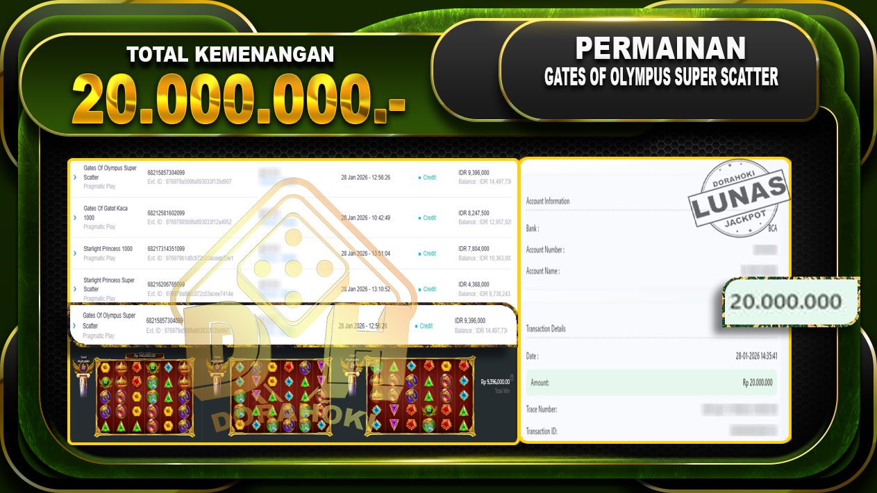 Bukti JP Gates Of Olympus Super Scatter – Selamat Kepada user ID : alixxxxx atas kemenangan Gates Of Olympus Super Scatter Dengan Nominal Sebesar Rp.20.000.000,- Yang pasti nya langsung LUNAS Sesuai Bukti.