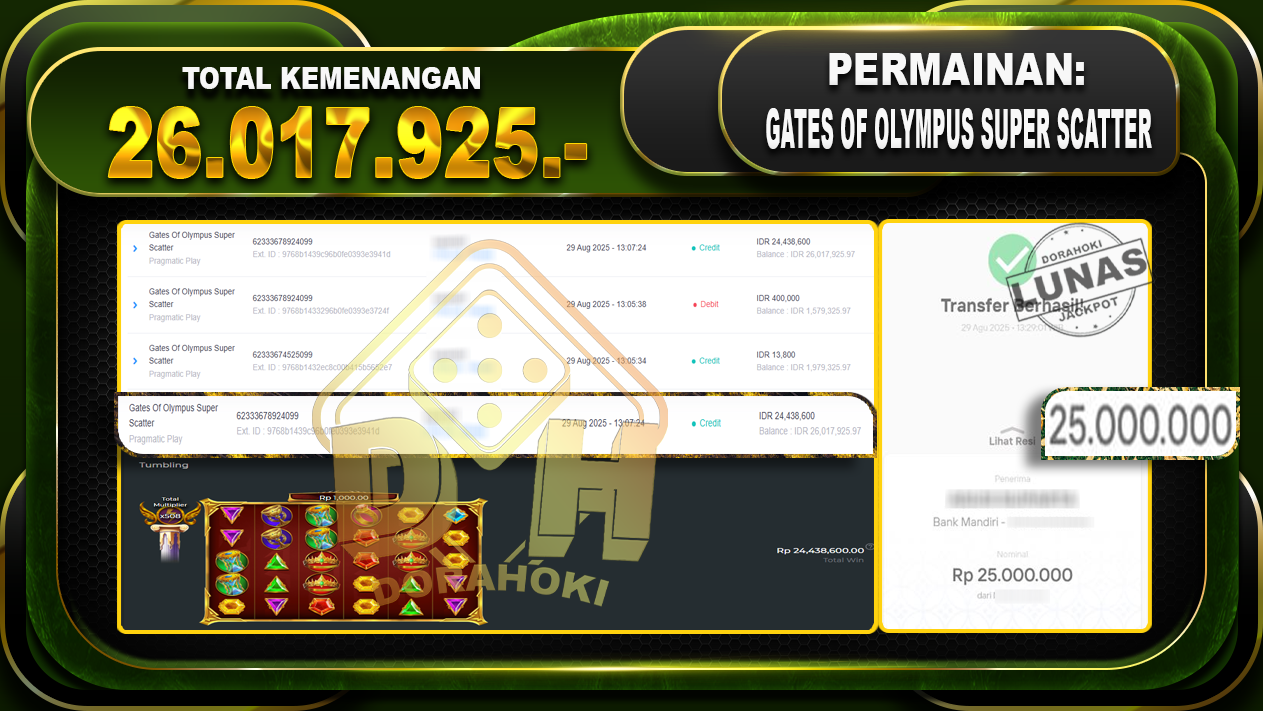 Bukti JP Gates Of Olympus Super Scatter – ucapkan selamat kepada user id Sarxxx atas kemenangan di Gates Of Olympus Super Scatter dengan total kemenangan Rp.26.017.925,- Yang pasti nya langsung LUNAS sesuai bukti ya bosku. Dorahoki nih bosku berapapun akan tetap kami bayar lunas ya bosku