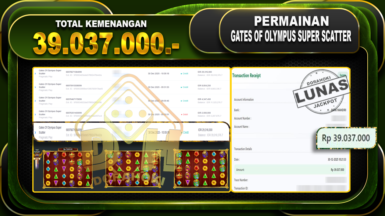 Bukti JP Gates Of Olympus Super Scatter – ucapkan selamat kepada user id kasxxxx atas kemenangan di Gates Of Olympus Super Scatter dengan total kemenangan Rp.39.037.000,- Yang pasti nya langsung LUNAS sesuai bukti ya bosku. Dorahoki nih bosku berapapun akan tetap kami bayar lunas ya bosku