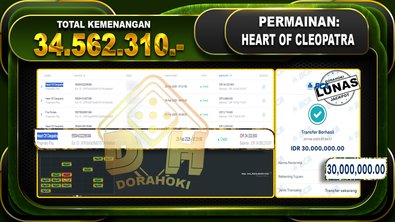 Bukti JP Heart Of Cleopatra – ucapkan selamat kepada user id abayaxxx atas kemenangan di Heart Of Cleopatra dengan total kemenangan Rp.34.562.310,- . Yang pasti nya langsung LUNAS sesuai bukti ya bosku. Dorahoki nih bosku berapapun akan tetap kami bayar lunas ya bosku.
