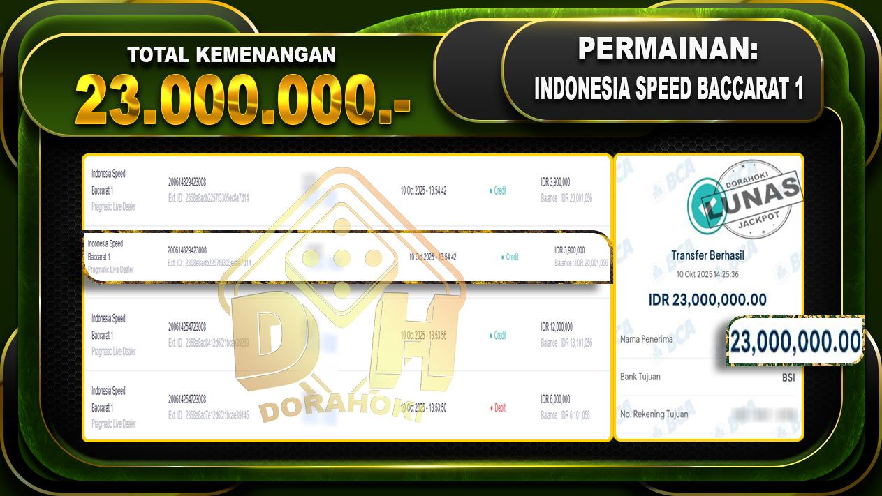 Bukti JP Indonesia Speed Baccarat 1 – ucapkan selamat kepada user id sindxxxxxx atas kemenangan di Indonesia Speed Baccarat 1 dengan total kemenangan Rp.23.000.000,- Yang pasti nya langsung LUNAS sesuai bukti ya bosku. Dorahoki nih bosku berapapun akan tetap kami bayar lunas ya bosku