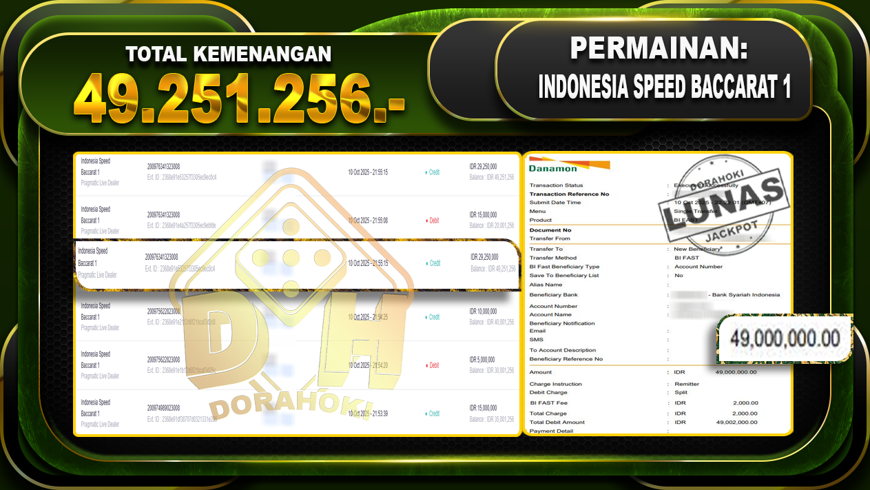 Bukti JP Indonesia Speed Baccarat 1 – ucapkan selamat kepada user id sindxxxx atas kemenangan di Indonesia Speed Baccarat 1 dengan total kemenangan Rp.49.251.256,- Yang pasti nya langsung LUNAS sesuai bukti ya bosku. Dorahoki nih bosku berapapun akan tetap kami bayar lunas ya bosku