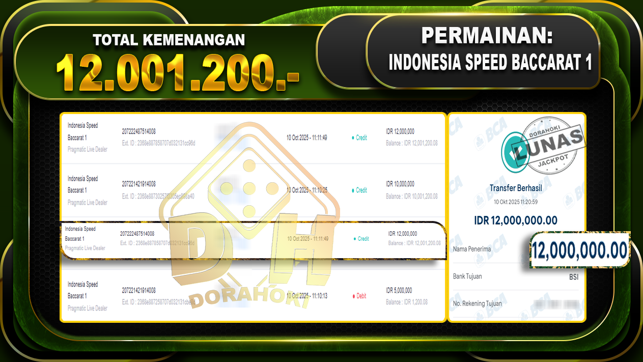 Bukti JP Indonesia Speed Baccarat 1 – ucapkan selamat kepada user id prakxxxxxx atas kemenangan di Indonesia Speed Baccarat 1 dengan total kemenangan Rp.12.001.200,- Yang pasti nya langsung LUNAS sesuai bukti ya bosku. Dorahoki nih bosku berapapun akan tetap kami bayar lunas ya bosku