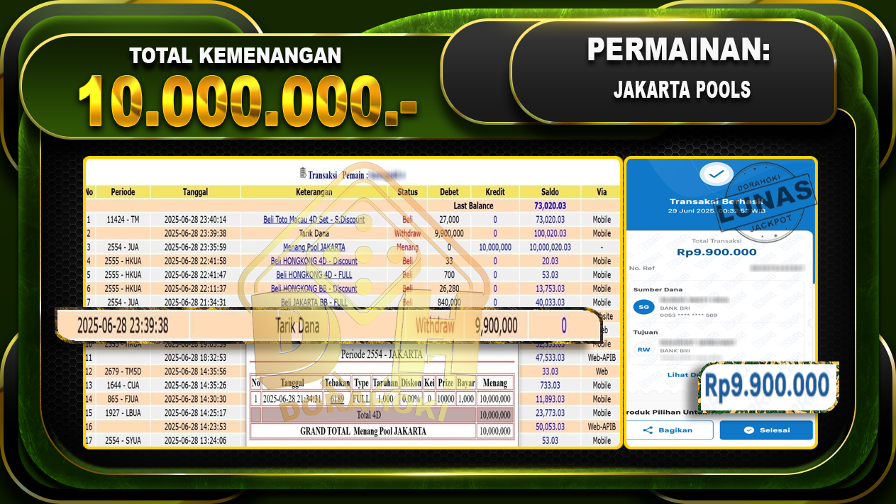 Bukti JP JAKARTA POOLS – ucapkan selamat kepada user id BOWxxx atas kemenangan di JAKARTA POOLS dengan total kemenangan Rp.10.000.000,- . Yang pasti nya langsung LUNAS sesuai bukti ya bosku. Dorahoki nih bosku berapapun akan tetap kami bayar lunas ya bosku.