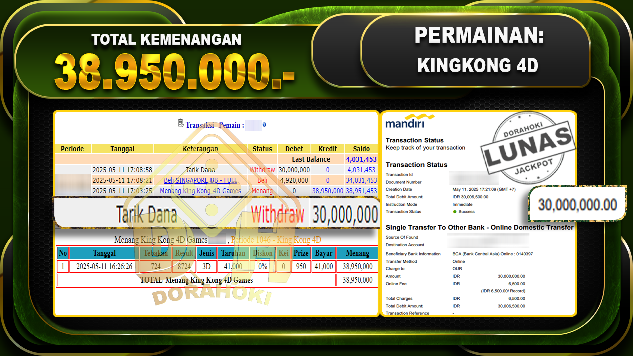 Bukti JP KingKong 4D – ucapkan selamat kepada user id Busxxx atas kemenangan di KingKong 4D dengan total kemenangan Rp.38.950.000,- . Yang pasti nya langsung LUNAS sesuai bukti ya bosku. Dorahoki nih bosku berapapun akan tetap kami bayar lunas ya bosku.