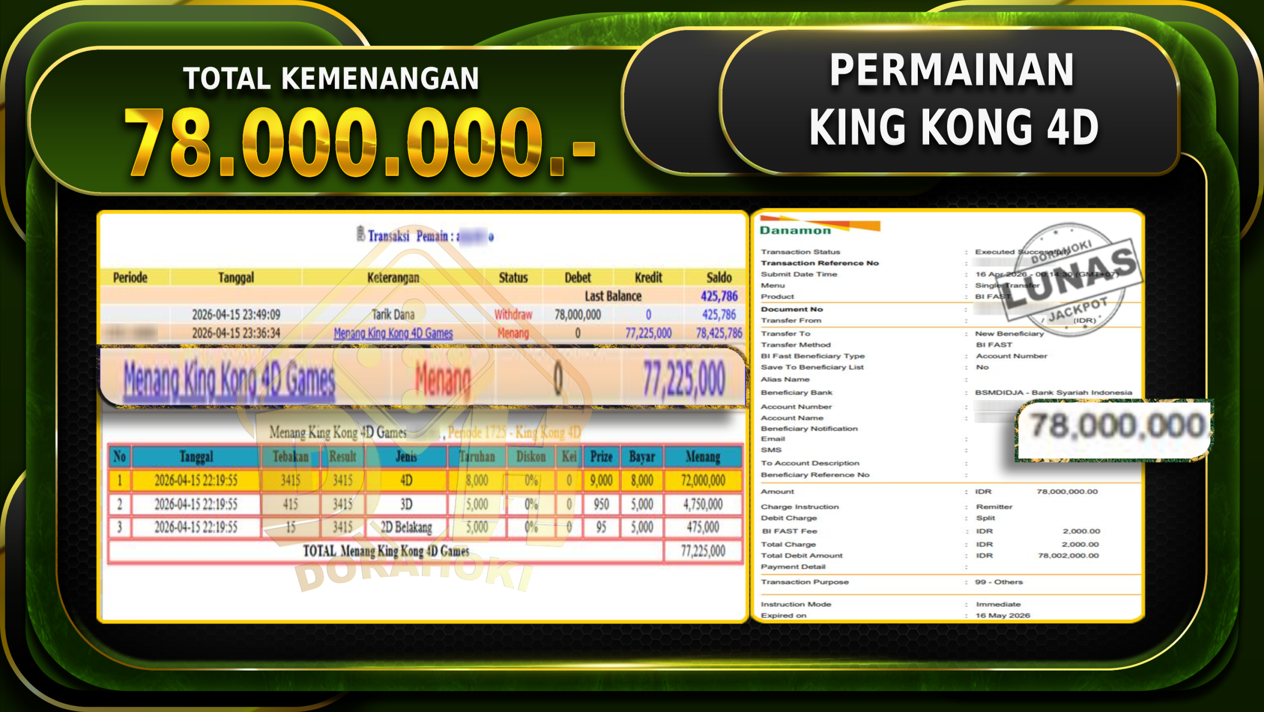 Bukti JP KingKong 4D – ucapkan selamat kepada user id Alexxxx atas kemenangan di KingKong 4D dengan total kemenangan Rp.28.500.000,- . Yang pasti nya langsung LUNAS sesuai bukti ya bosku. Dorahoki nih bosku berapapun akan tetap kami bayar lunas ya bosku.