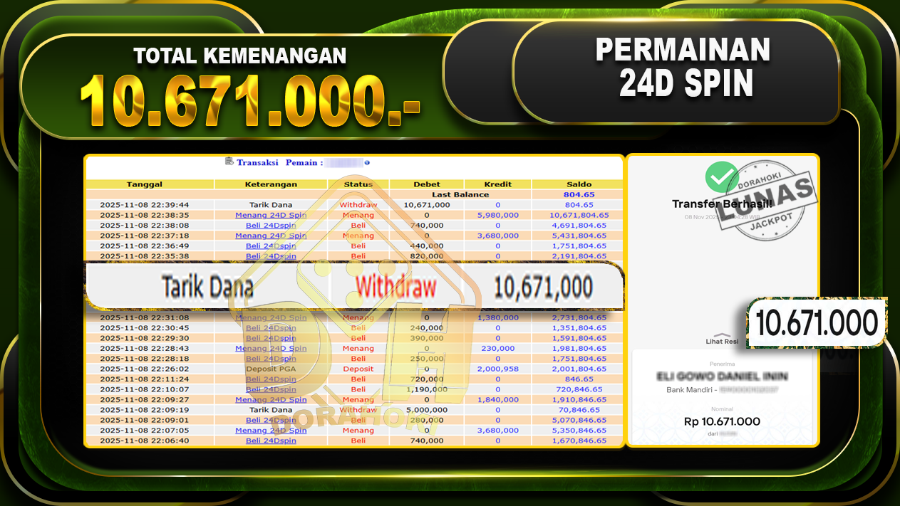 Bukti JP Livegames 24D Spin – ucapkan selamat kepada user id rajxxxxx atas kemenangan di Livegames 24D Spin dengan total kemenangan Rp.10.671.000,- . Yang pasti nya langsung LUNAS sesuai bukti ya bosku. Dorahoki nih bosku berapapun akan tetap kami bayar lunas ya bosku.