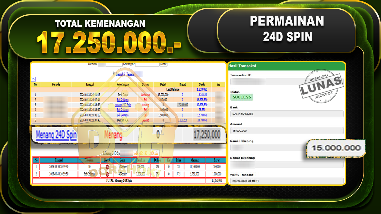 Bukti JP Livegames 24D Spin – ucapkan selamat kepada user id Wikxxxxx atas kemenangan di Livegames 24D Spin dengan total kemenangan Rp.17.250.000,- . Yang pasti nya langsung LUNAS Sesuai Bukti.