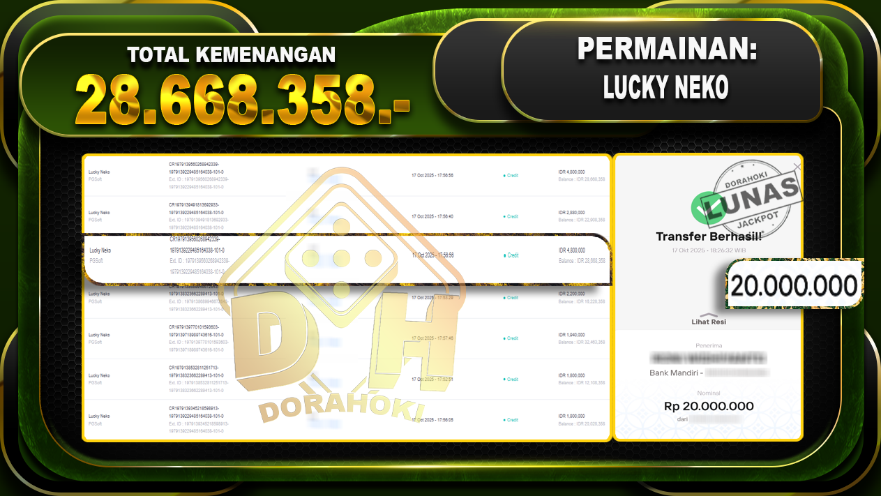 Bukti JP Lucky Neko- Yang kami berikan ini sah dan real tanpa di rekayasa bosku dan hanya bertujuan untuk meningkatkan kepercayaan member kami dan memberikan kenyamanan saat bermain jadi bosku tidak perlu khawatir MENANG BERAPAPUN PASTI KAMI BAYAR LUNAS!!
