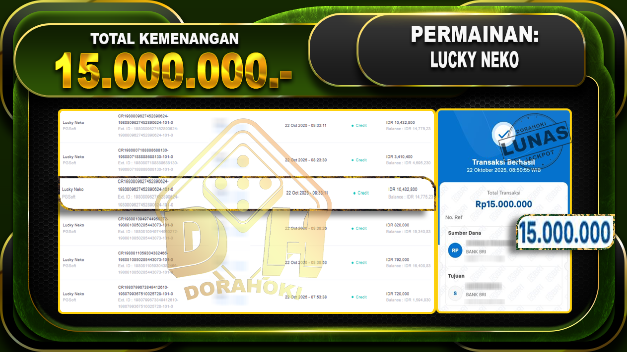 Bukti JP Lucky Neko – ucapkan selamat kepada user id kisxxx atas kemenangan di Lucky Neko dengan total kemenangan Rp.15.000.000,- Yang pasti nya langsung LUNAS sesuai bukti ya bosku. Dorahoki nih bosku berapapun akan tetap kami bayar lunas ya bosku.