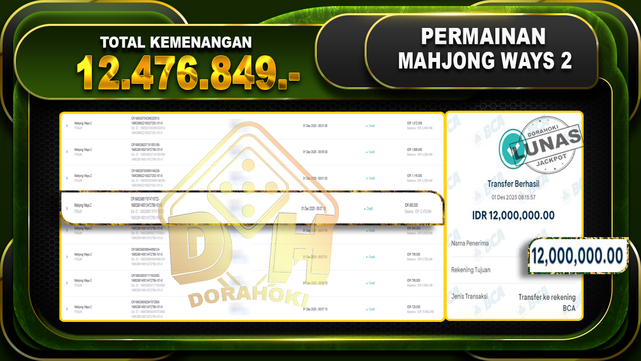Bukti JP Mahjong Ways 2 – ucapkan selamat kepada user id kacxxxxx atas kemenangan di Mahjong Ways 2 dengan total kemenangan Rp.12.476.849,- Yang pasti nya langsung LUNAS sesuai bukti ya bosku. Dorahoki nih bosku berapapun akan tetap kami bayar lunas ya bosku