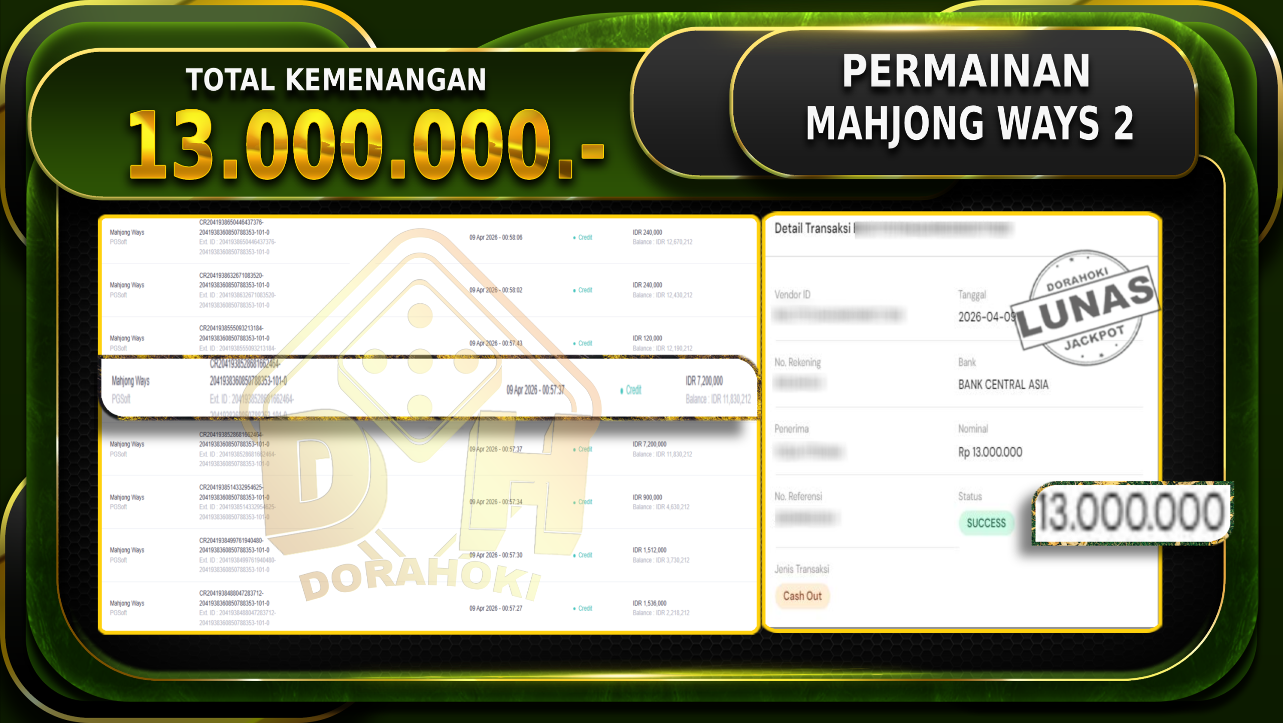 Bukti JP Mahjong Ways 2 – Selamat Kepada User id Sanxxx atas kemenangan Mahjong Ways 2 Dengan Nominal Sebesar Rp 13.000.000,- . Yang pasti nya langsung LUNAS Sesuai Bukti.