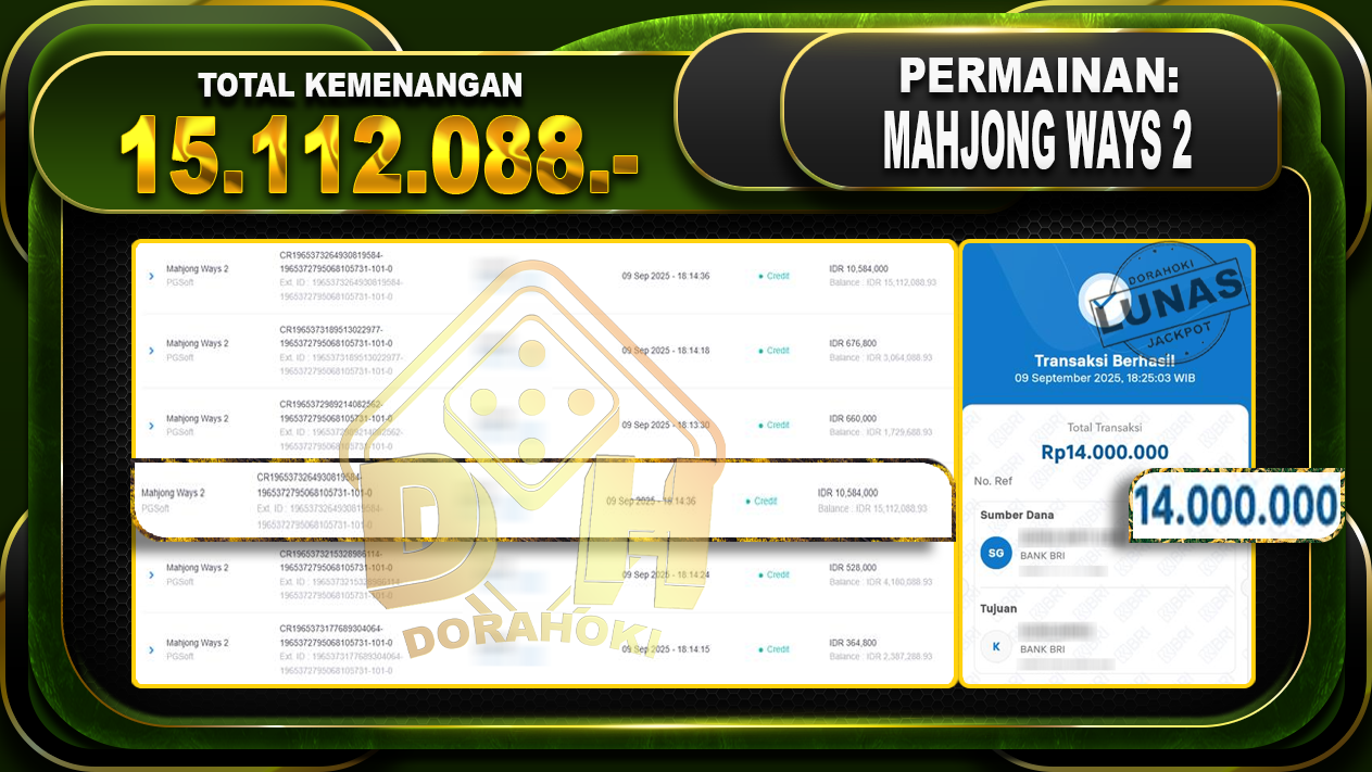 Bukti JP Mahjong Ways 2 – ucapkan selamat kepada user id SOdxxxxx atas kemenangan di Mahjong Ways 2 dengan total kemenangan Rp.15.112.088,- Yang pasti nya langsung LUNAS sesuai bukti ya bosku. Dorahoki nih bosku berapapun akan tetap kami bayar lunas ya bosku