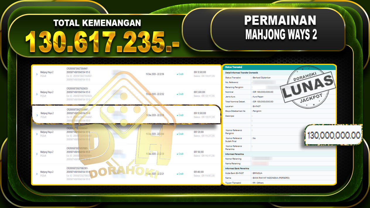 Bukti JP Mahjong Ways 2 – ucapkan selamat kepada user id malxxxxx atas kemenangan di Mahjong Ways 2 dengan total kemenangan Rp.130.617.235,- Yang pasti nya langsung LUNAS sesuai bukti ya bosku. Dorahoki nih bosku berapapun akan tetap kami bayar lunas ya bosku