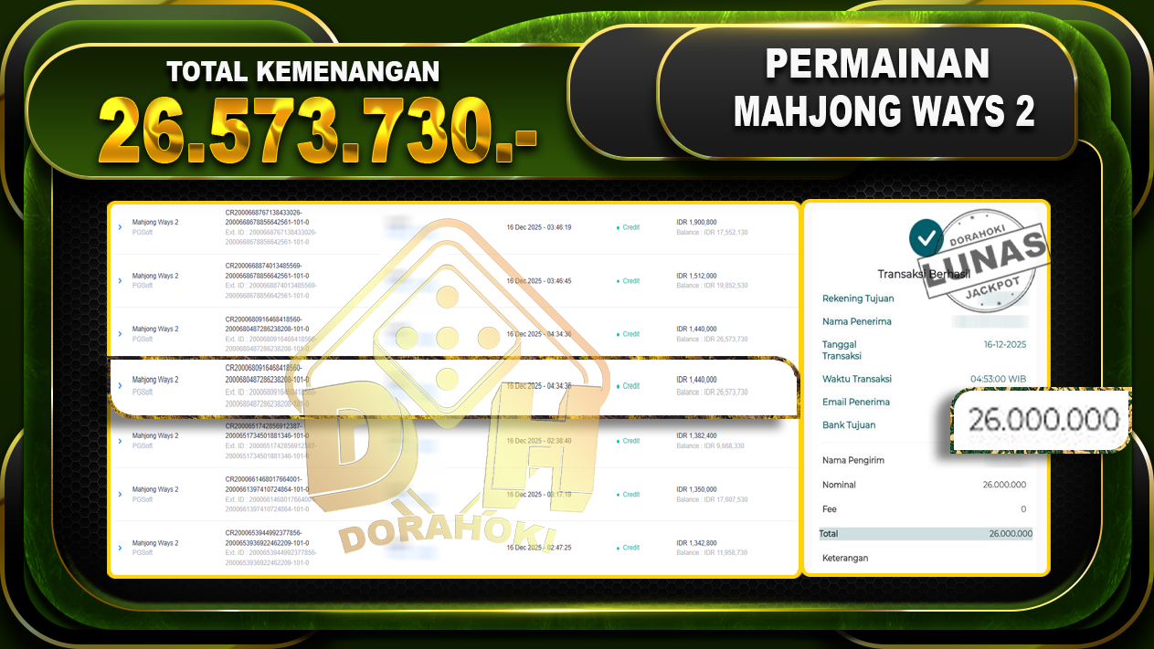 Bukti JP Mahjong Ways 2 – ucapkan selamat kepada user id awaxxx atas kemenangan di Mahjong Ways 2 dengan total kemenangan Rp.26.573.730,- Yang pasti nya langsung LUNAS sesuai bukti ya bosku. Dorahoki nih bosku berapapun akan tetap kami bayar lunas ya bosku