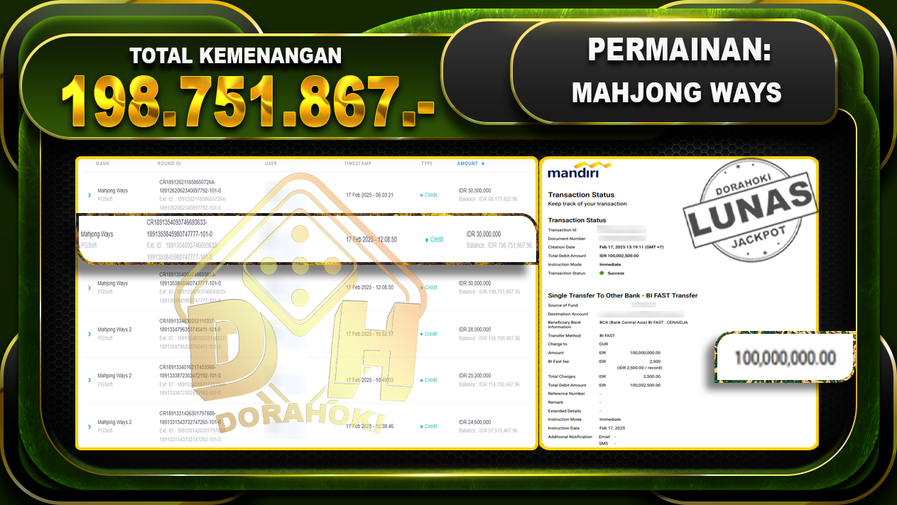 Bukti JP MAHJONG WAYS 2 – ucapkan selamat kepada user id Bbyxxx atas kemenangan di MAHJONG WAYS 2 dengan total kemenangan Rp.198.751.867,- . Yang pasti nya langsung LUNAS sesuai bukti ya bosku. Dorahoki nih bosku berapapun akan tetap kami bayar lunas ya bosku.