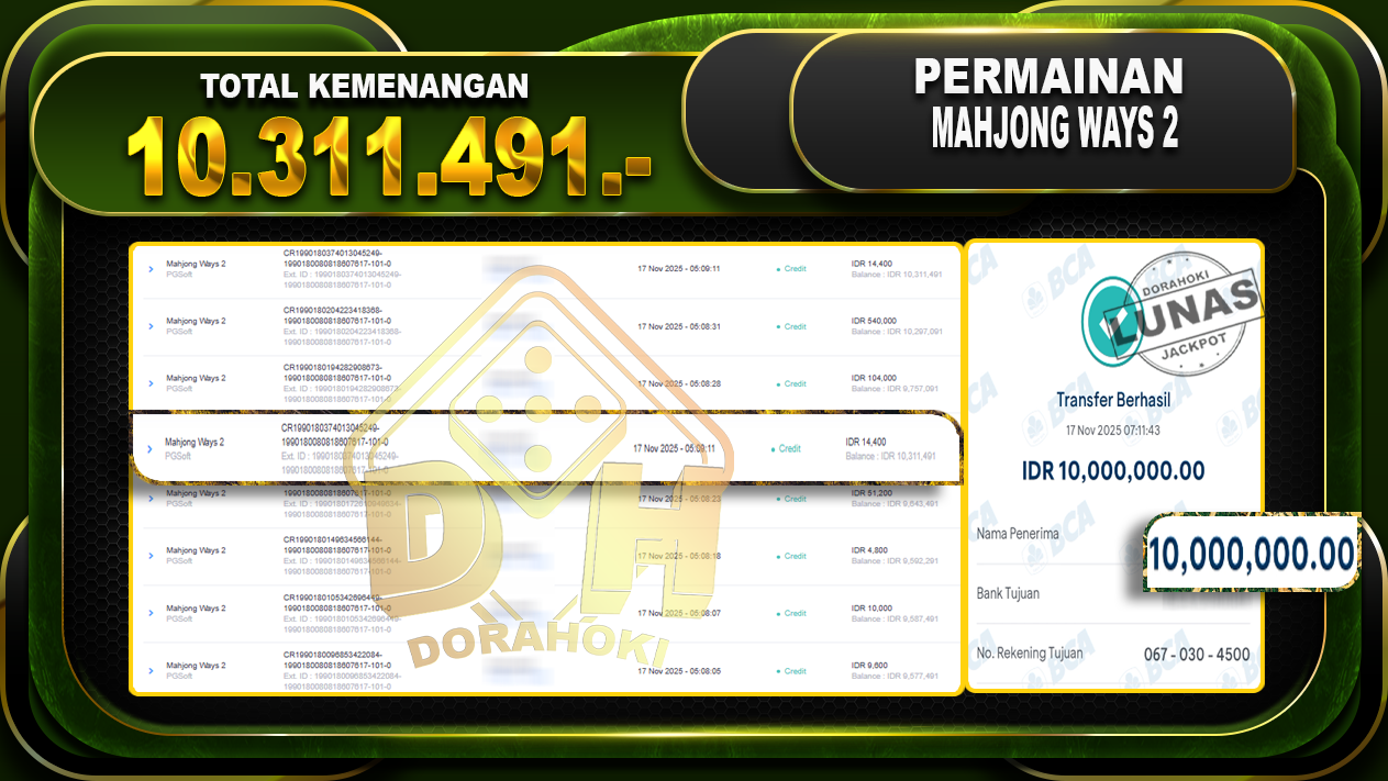 Bukti JP Mahjong Ways 2 – ucapkan selamat kepada user id kamxxxxx atas kemenangan di Mahjong Ways 2 dengan total kemenangan Rp.10.311.491,- Yang pasti nya langsung LUNAS sesuai bukti ya bosku. Dorahoki nih bosku berapapun akan tetap kami bayar lunas ya bosku