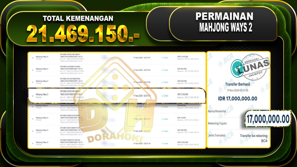 Bukti JP Mahjong Ways 2 – ucapkan selamat kepada user id bawxx atas kemenangan di Mahjong Ways 2 dengan total kemenangan Rp.21.469.150,- Yang pasti nya langsung LUNAS sesuai bukti ya bosku. Dorahoki nih bosku berapapun akan tetap kami bayar lunas ya bosku