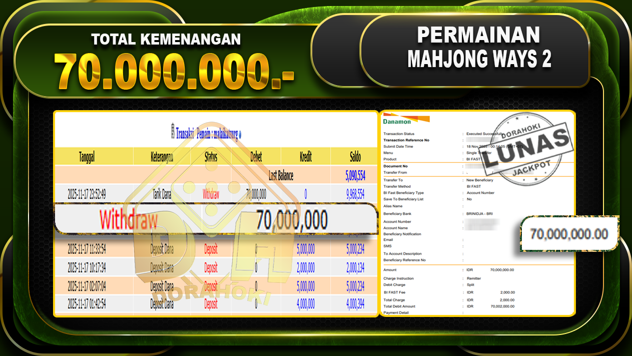 Bukti JP Mahjong Ways 2 – ucapkan selamat kepada user id malxxxxx atas kemenangan di  Mahjong Ways 2 dengan total kemenangan Rp.70.000.000,- Yang pasti nya langsung LUNAS sesuai bukti ya bosku. Dorahoki nih bosku berapapun akan tetap kami bayar lunas ya bosku