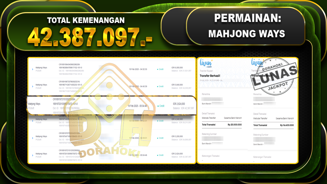 Bukti JP MAHJONG WAYS 2 – ucapkan selamat kepada user id deboy1xxx atas kemenangan di MAHJONG WAYS 2 dengan total kemenangan Rp.42.387.097,- . Yang pasti nya langsung LUNAS sesuai bukti ya bosku. Dorahoki nih bosku berapapun akan tetap kami bayar lunas ya bosku.