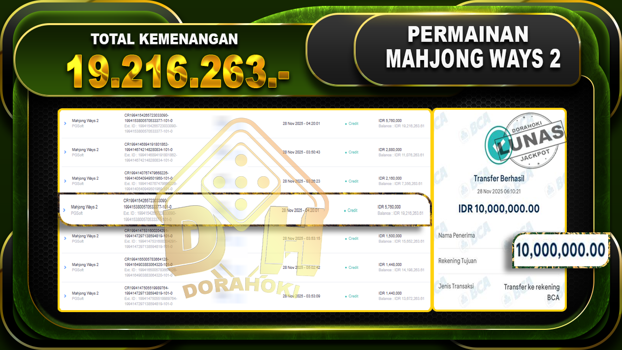 Bukti JP Mahjong Ways 2 – ucapkan selamat kepada user id dinxxxxx atas kemenangan di Mahjong Ways 2 dengan total kemenangan Rp.19.216.263,- Yang pasti nya langsung LUNAS sesuai bukti ya bosku. Dorahoki nih bosku berapapun akan tetap kami bayar lunas ya bosku