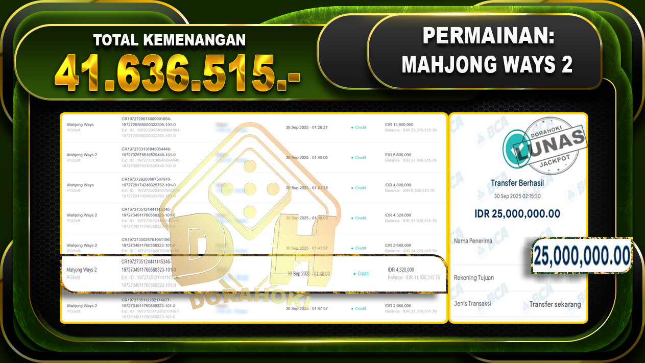 Bukti JP Mahjong Ways 2 – ucapkan selamat kepada user id bbyxxxx atas kemenangan di Mahjong Ways 2 dengan total kemenangan Rp.41.636.515,- Yang pasti nya langsung LUNAS sesuai bukti ya bosku. Dorahoki nih bosku berapapun akan tetap kami bayar lunas ya bosku