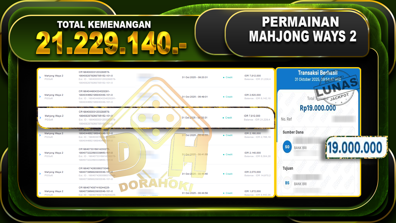 Bukti JP Mahjong Ways 2 – ucapkan selamat kepada user id malxxxx atas kemenangan di Mahjong Ways 2 dengan total kemenangan Rp.21.229.140,- Yang pasti nya langsung LUNAS sesuai bukti ya bosku. Dorahoki nih bosku berapapun akan tetap kami bayar lunas ya bosku